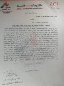 كشفت منظمة زيرو فساد أنها تقدمت بخاطب للنائب العام لجمهورية السودان تاج السر الحبر بتاريخ 22 فبراير الماضي تطالب فيه بشطب البلاغ المقدم من رئس المنظمة السابق نادر العبيد ضد رجل الاعمال التركي أوكتاي شعبان حسني بتهمة الثراء الحرام وغسيل الاموال.