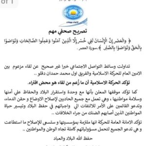 قالت الحركة الإسلامية السودانية في تصريح تحصل محرر اسفير نيوز علي نسخة منه بان ما تم تداوله في الوسائط المتعددة الاجتماعية خبرا غير صحيح.