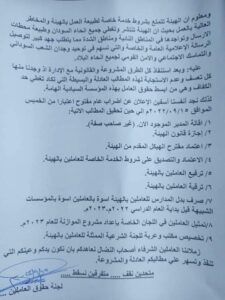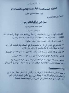أعلنت لجنة حقوق العاملين بهيئة البث الإذاعي عن الدخول في إضراب مفتوح يبدأ حتى الخميس المقبل 15 سبتمبر 2022م حتى تتم الاستجابة لمطالبهم والتي أبرزها ,إقالة المدير وإجازة قانون الهيئة اعتماد مقترح الهيكل المقدم من الهيئة وترفيع وترقية العاملين بالهيئة