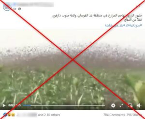 الفيديو يظهر أسرابا من الطيور تطير فوق حقل أخضر، وكتب أحد ناشري الفيديو: “طيور الزرزور تهاجم المزارع في منطقة عد الفرسان، ولاية جنوب دارفور”.