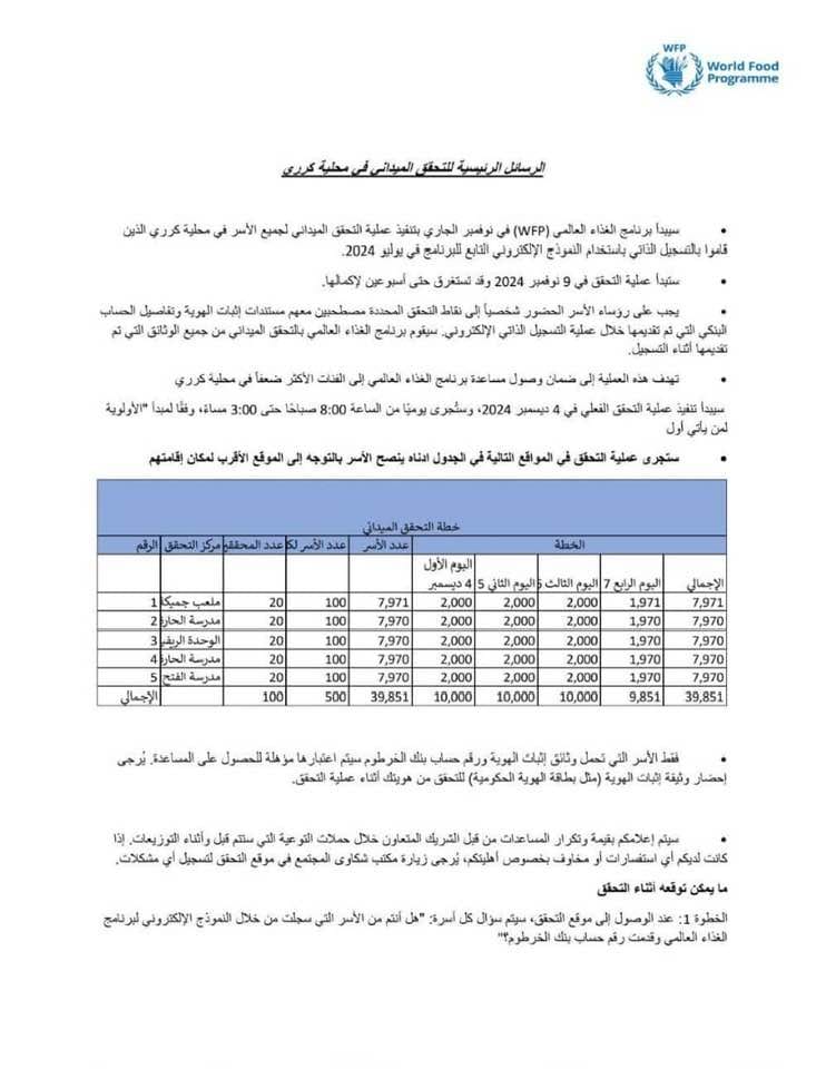 وأكد انه يجب الأسر الحضور شخصياً إلى نقاط التحقق المحددة مصطحبين معهم مستندات إثبات الهوية وتفاصيل الحساب البنكي التي تم تقديمها خلال عملية التسجيل الذاتي الإلكتروني سيقوم برنامج الغذاء العالمي بالتحقق الميداني من جميع الوثائق التي تم تقديمها أثناء التسجيل.